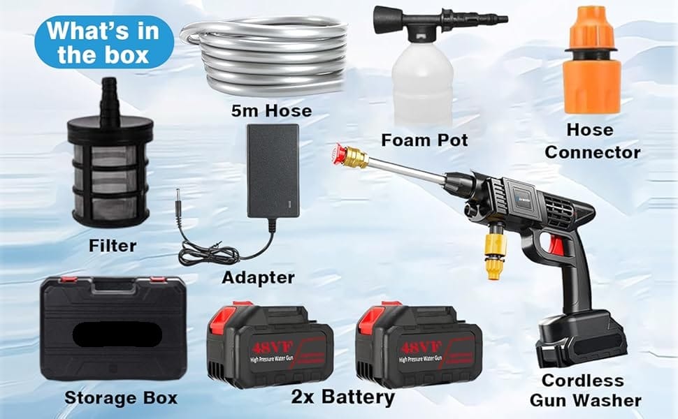 الطقم يأتي بـ بطاريتين 48V؛ البطارية الواحدة تكفي لتنظيف سيارة بالكامل، ومع وجود البطارية الثانية، يمكنك مضاعفة وقت العمل لتنظيف أو ري الحديقة دون الحاجة للانتظار لشحنها.